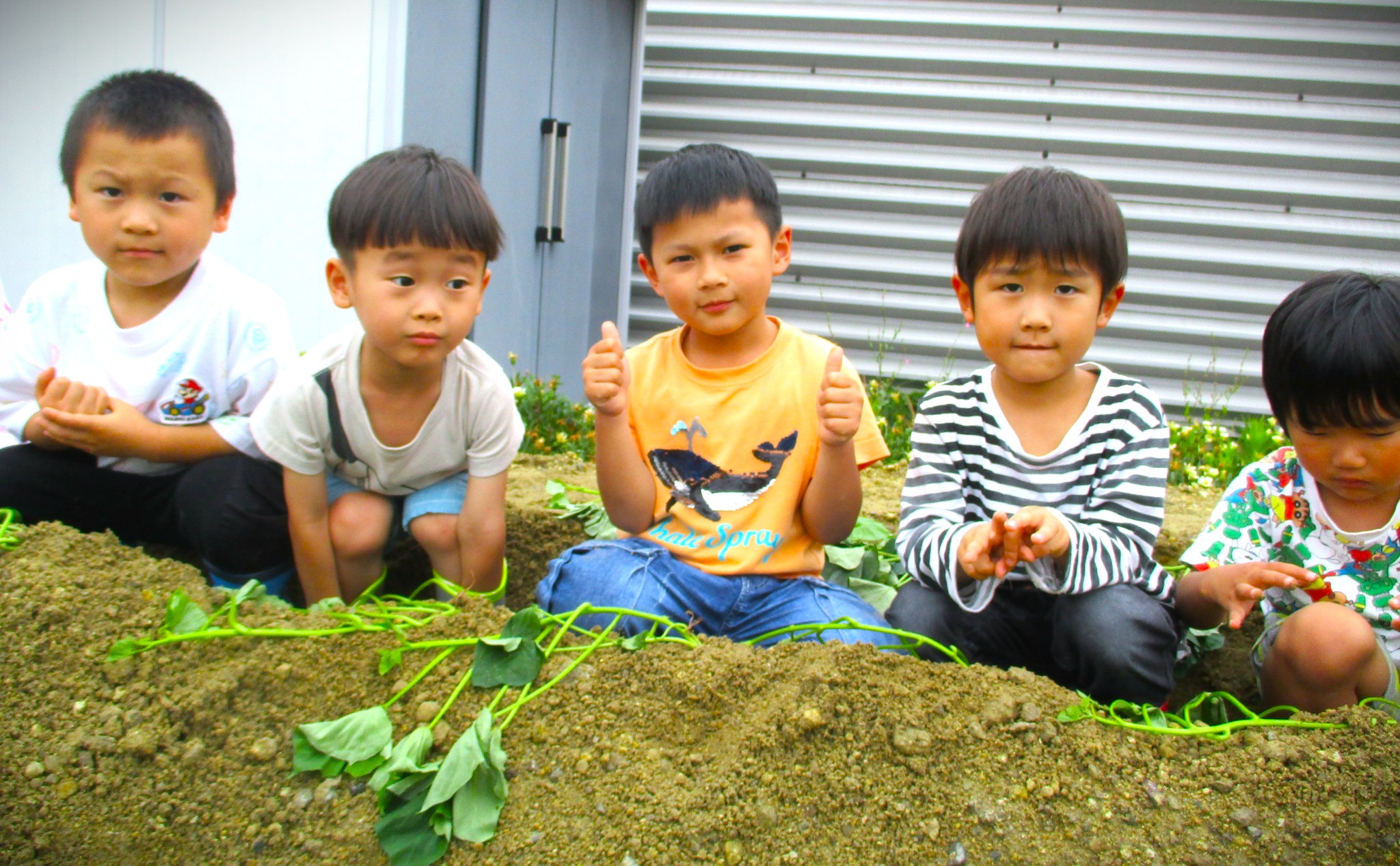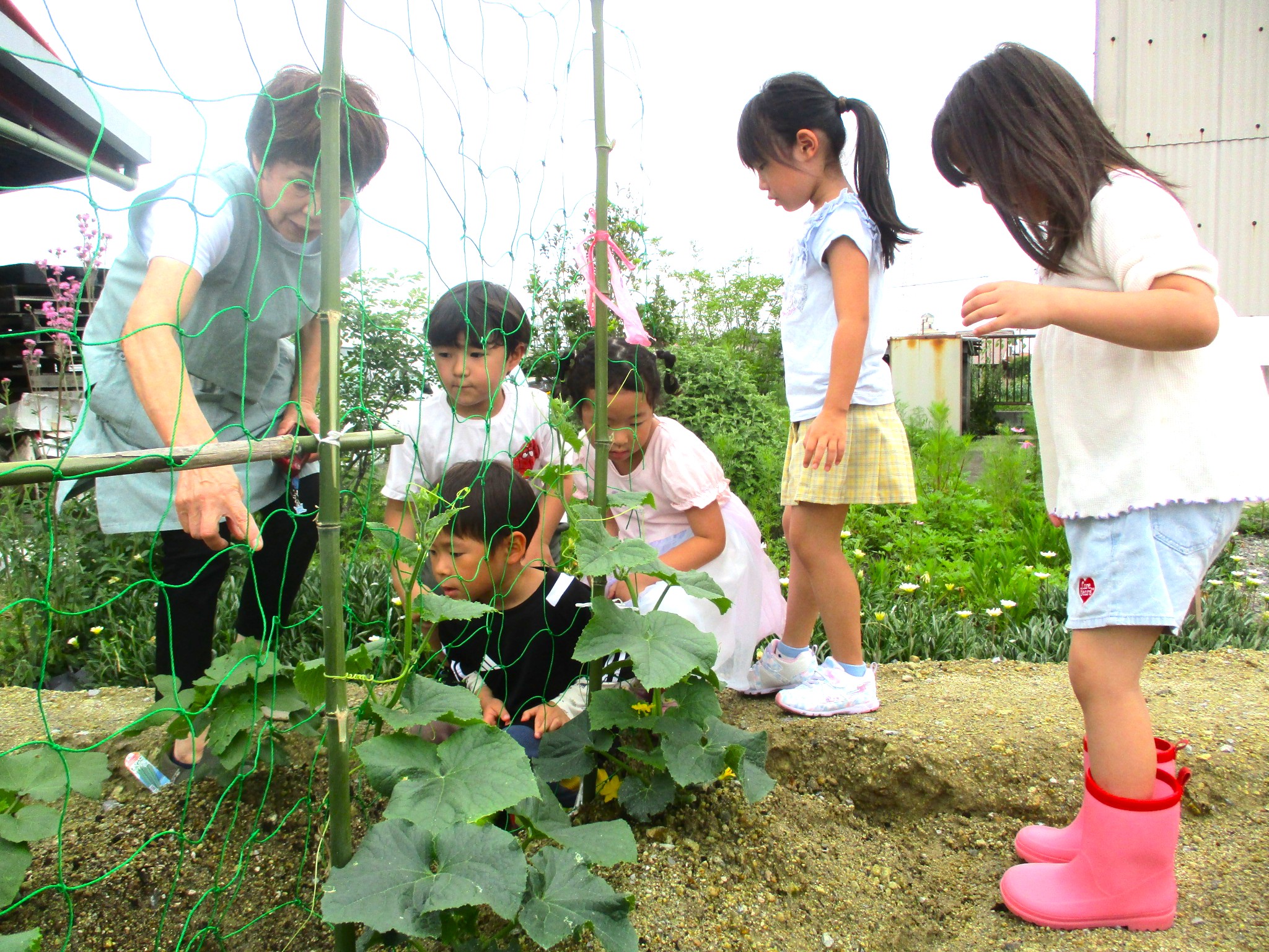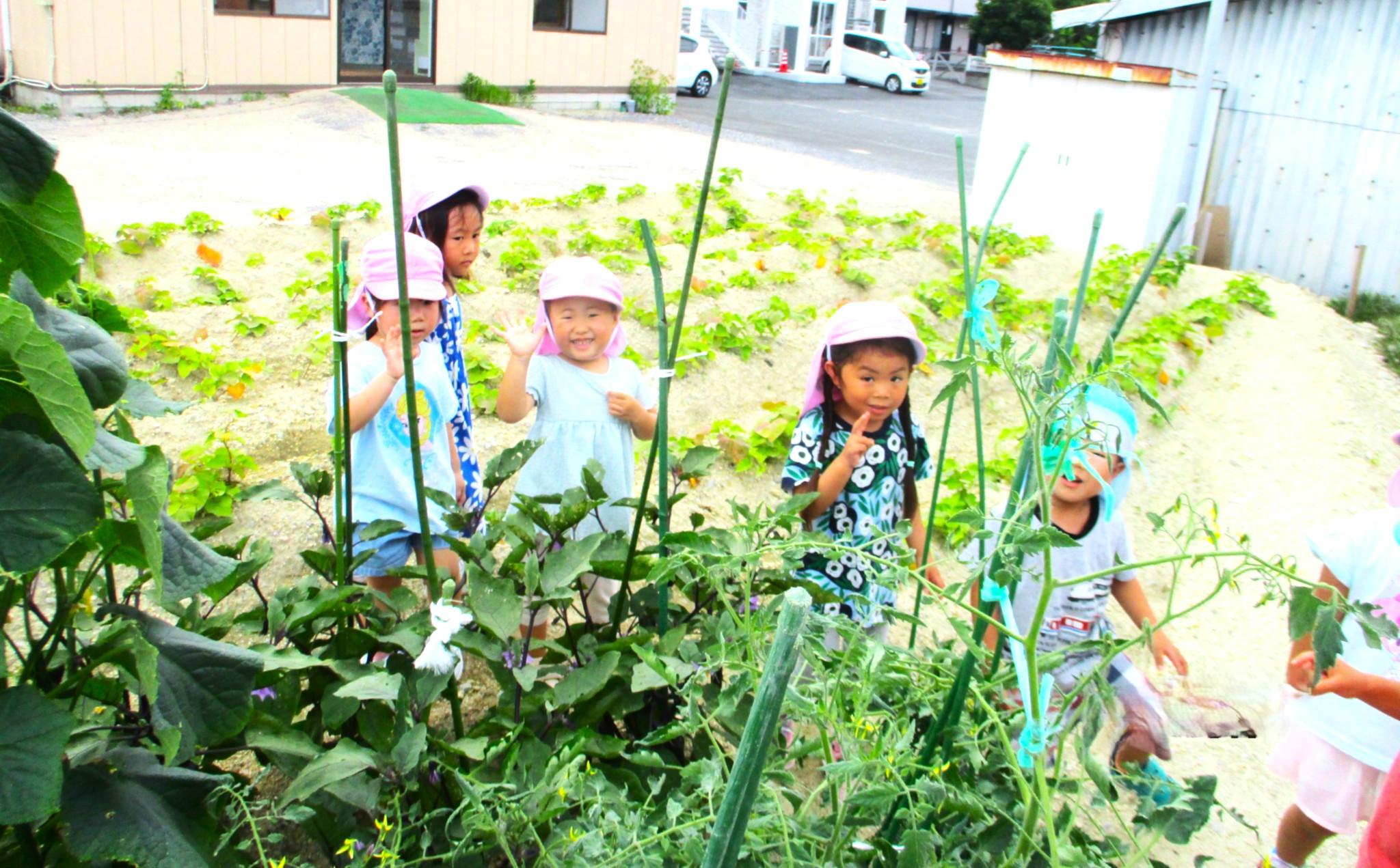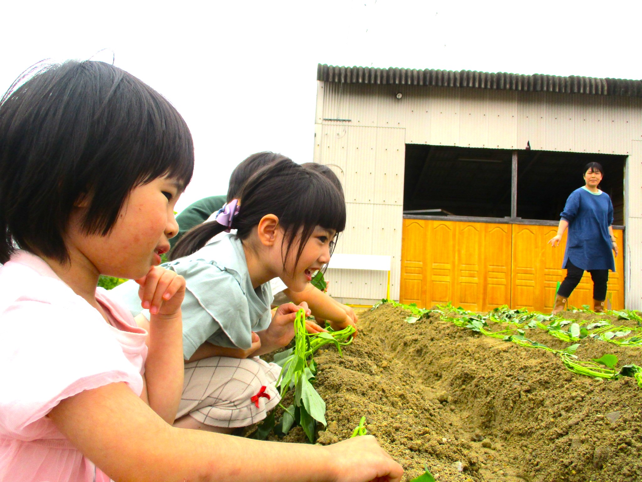 畑では夏野菜や芋の苗を植えて、「大きくなあれ」とお世話をしながら、実りの日を楽しみに待つ子どもたち。
