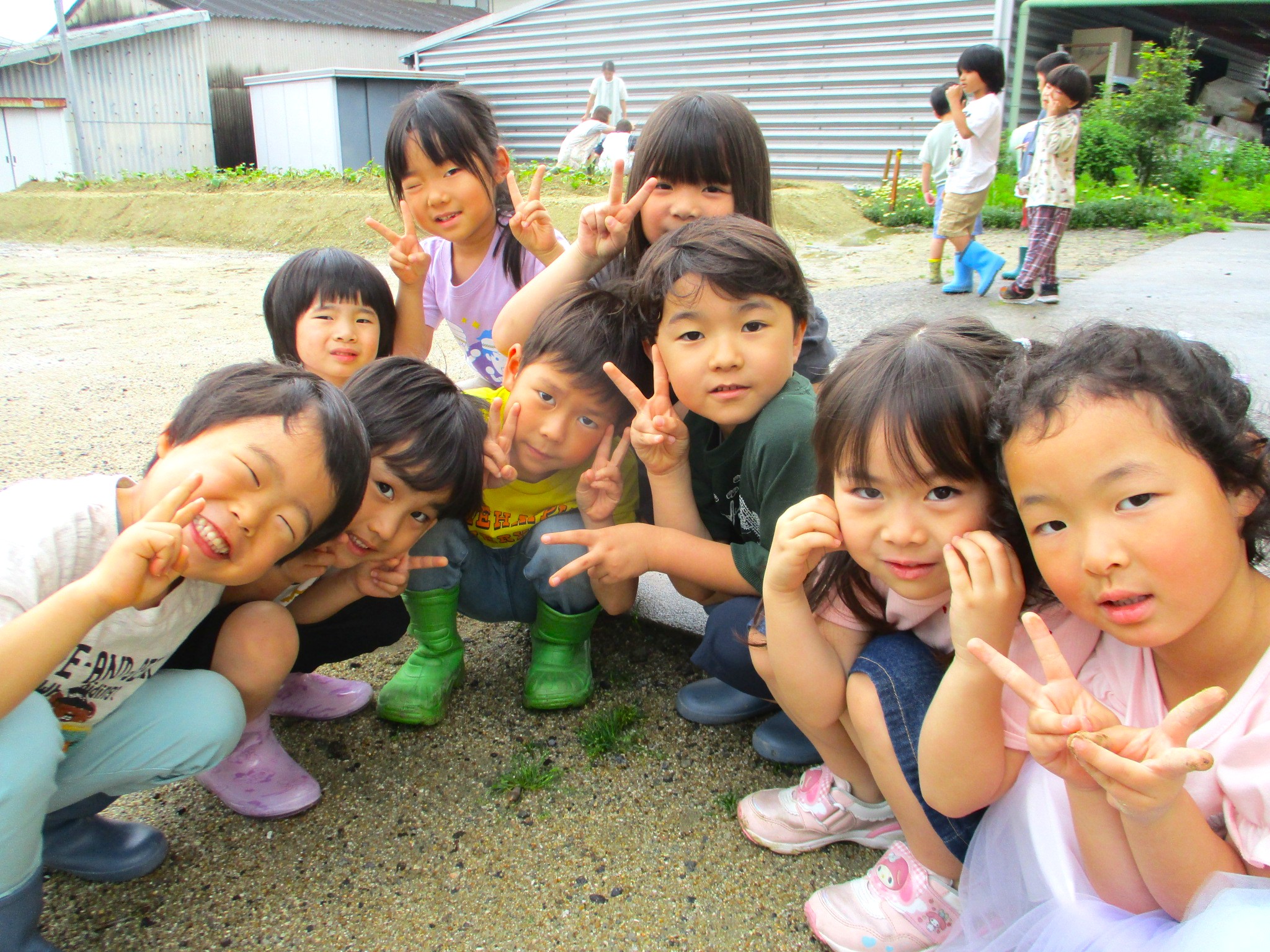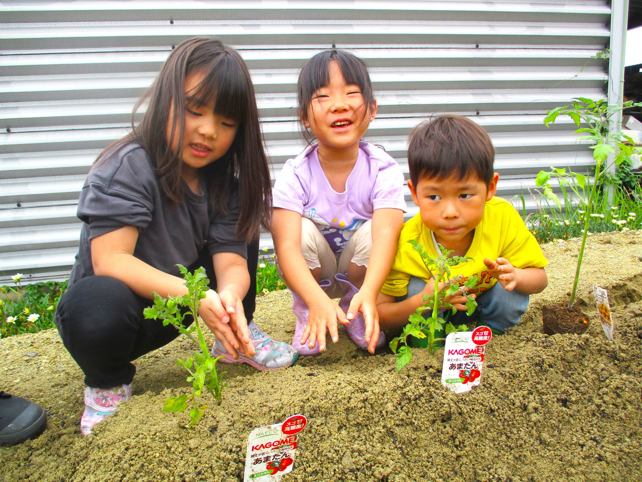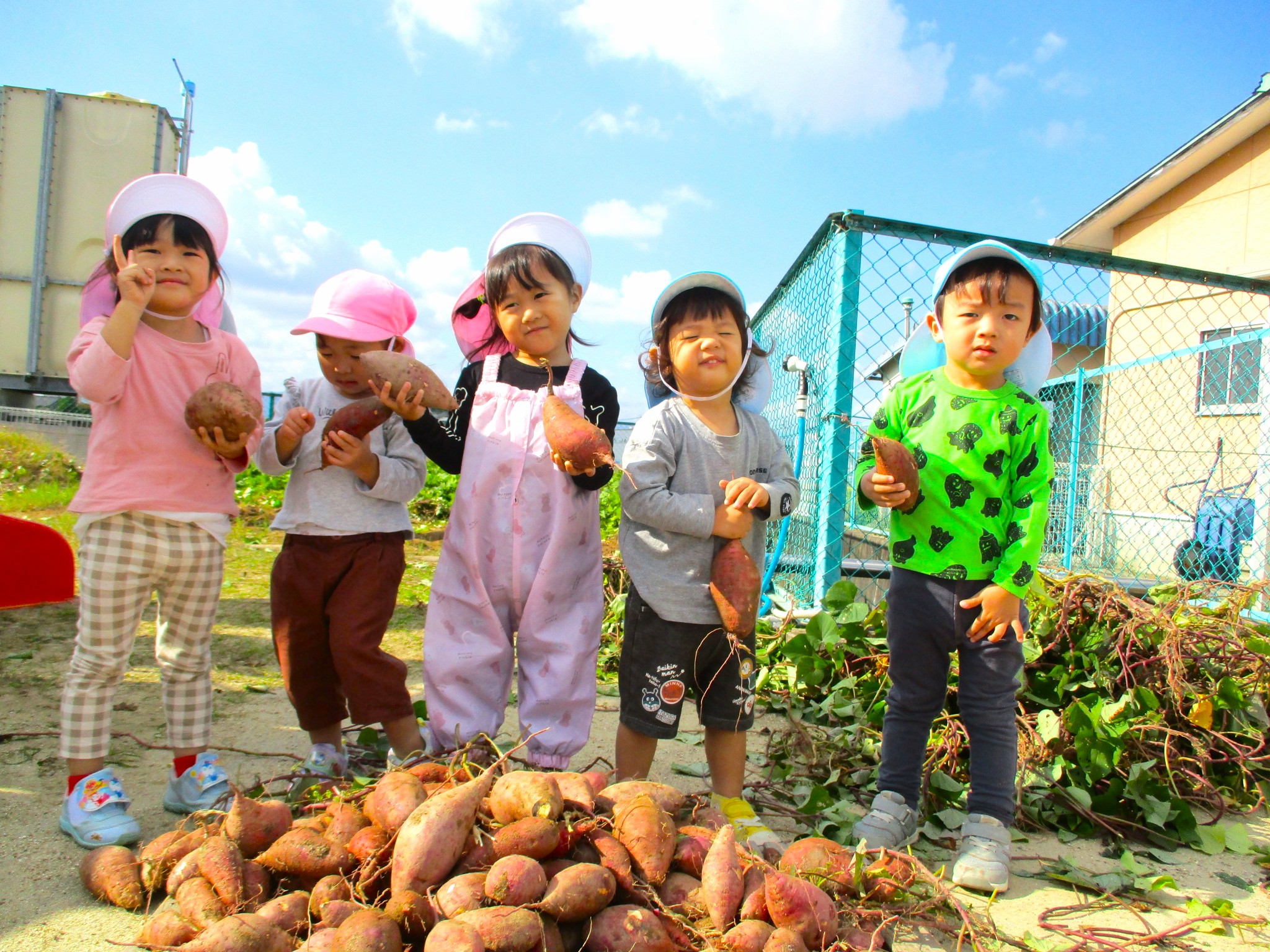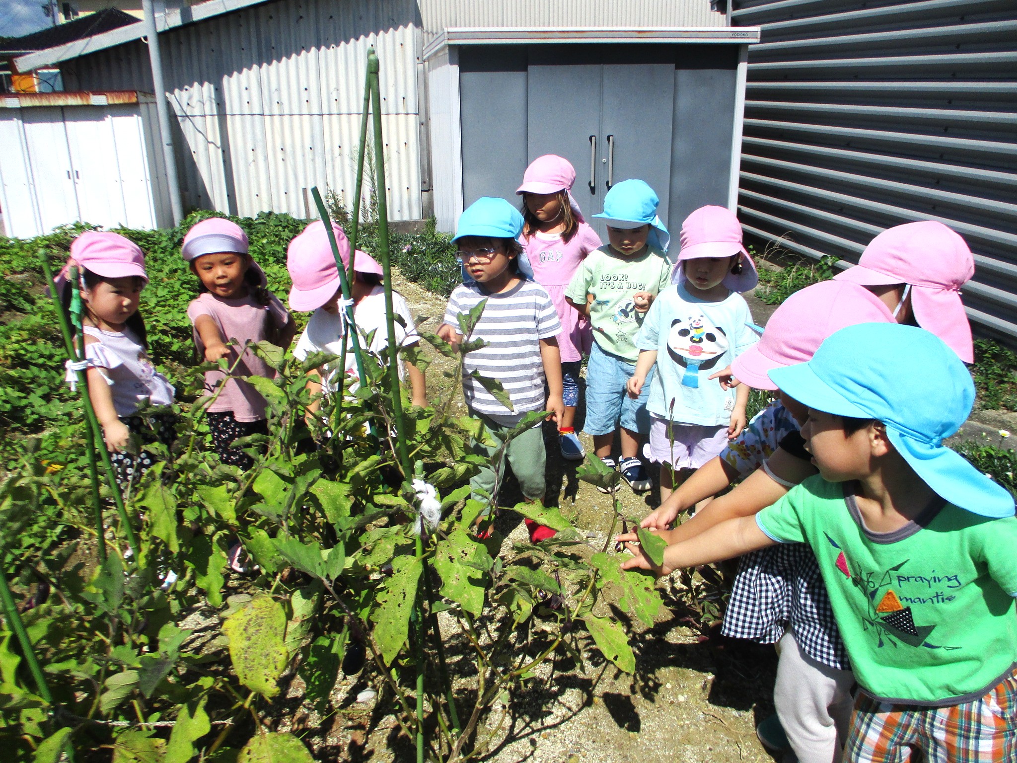 畑では夏野菜や芋の苗を植えて、「大きくなあれ」とお世話をしながら、実りの日を楽しみに待つ子どもたち。