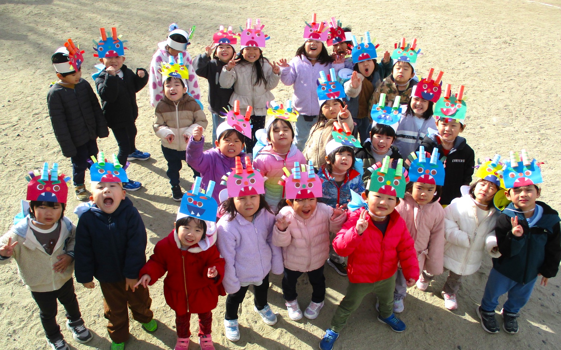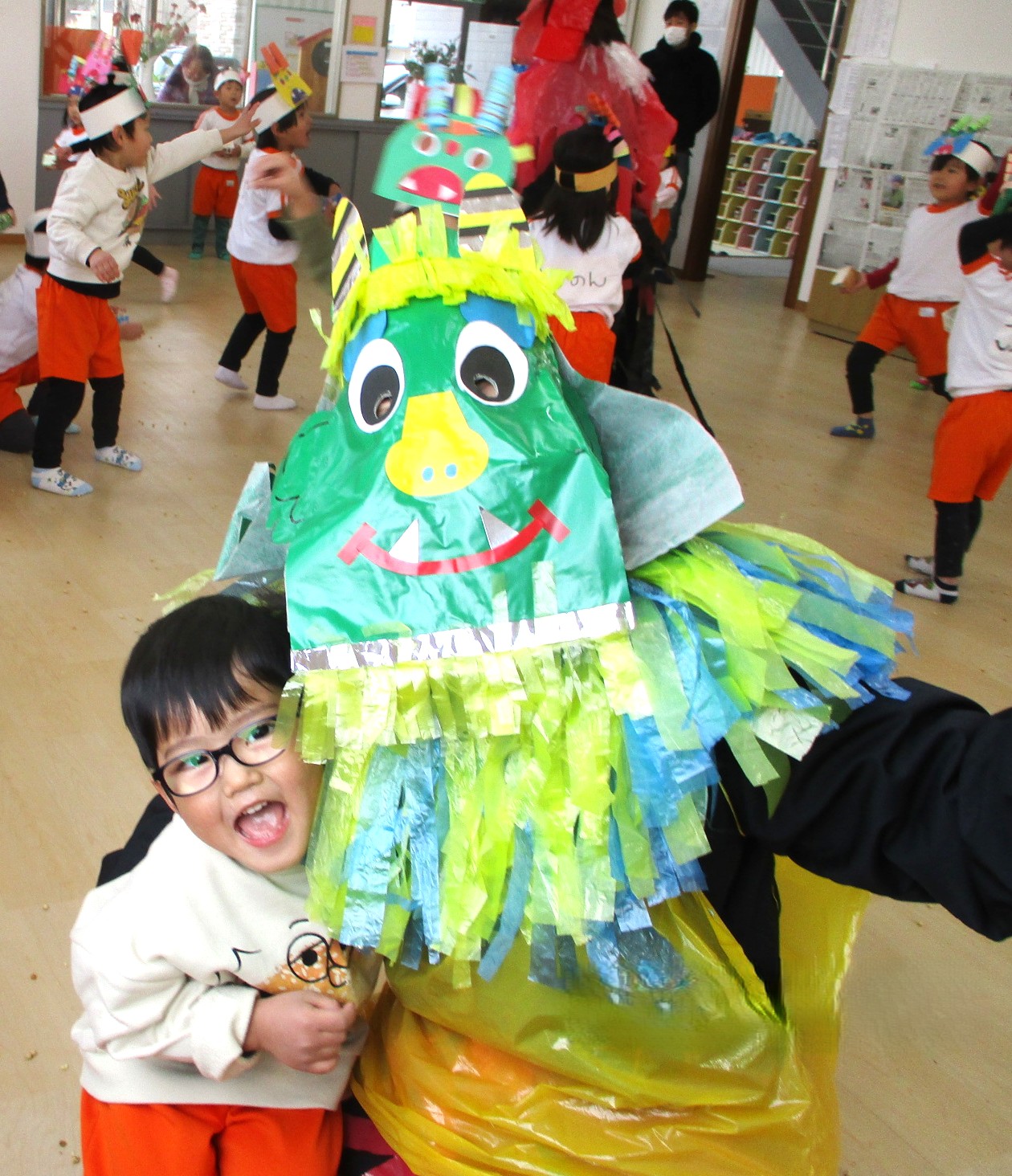 餅つきやお楽しみ会では友だちと笑顔でふれあい、節分には「鬼は外、福は内!」と元気に豆まきをします。