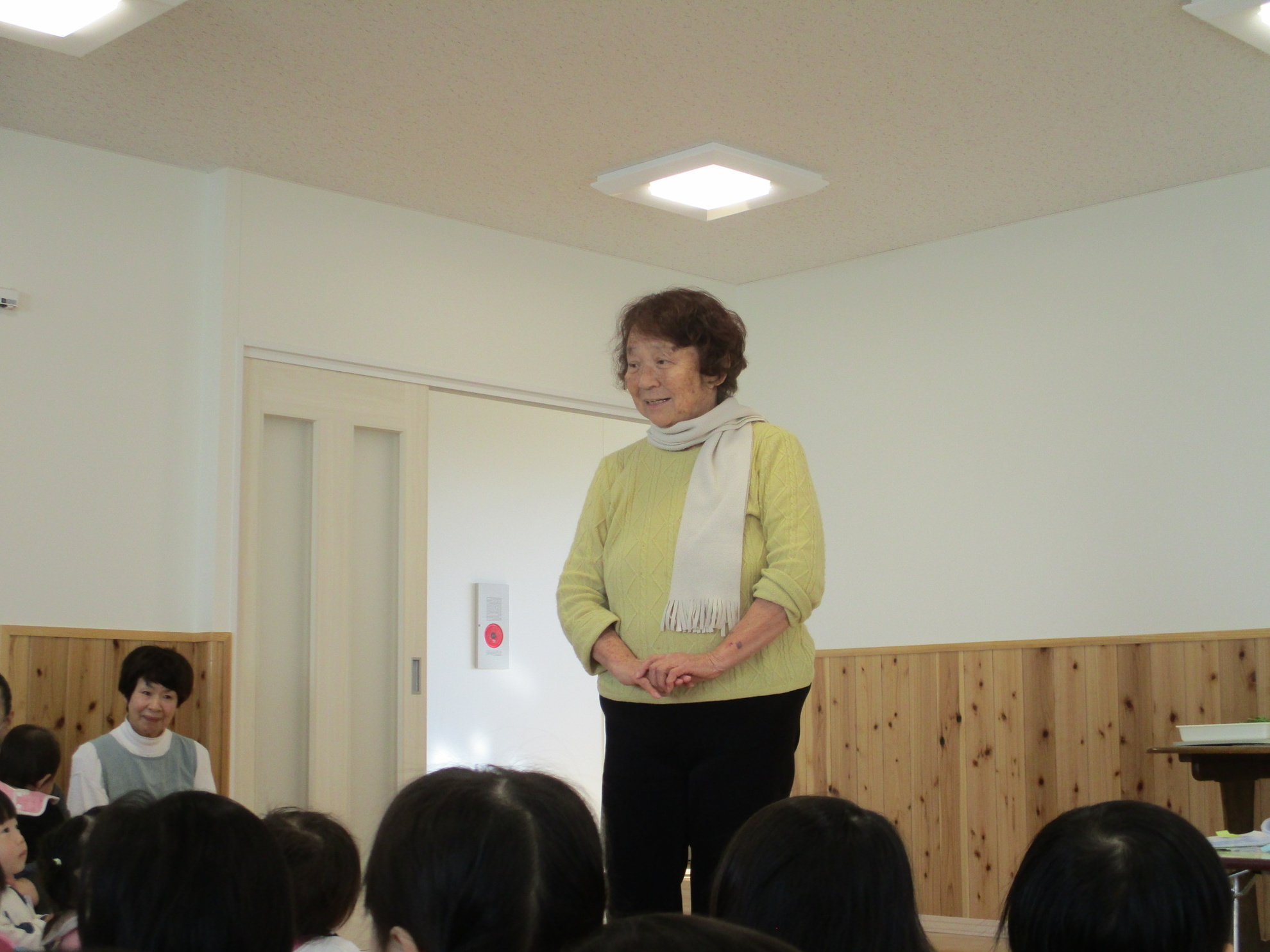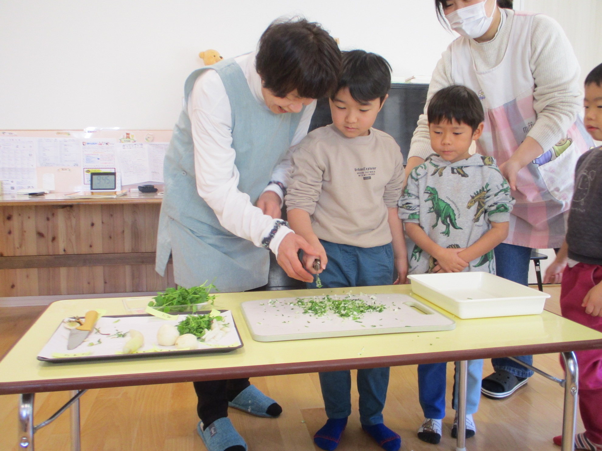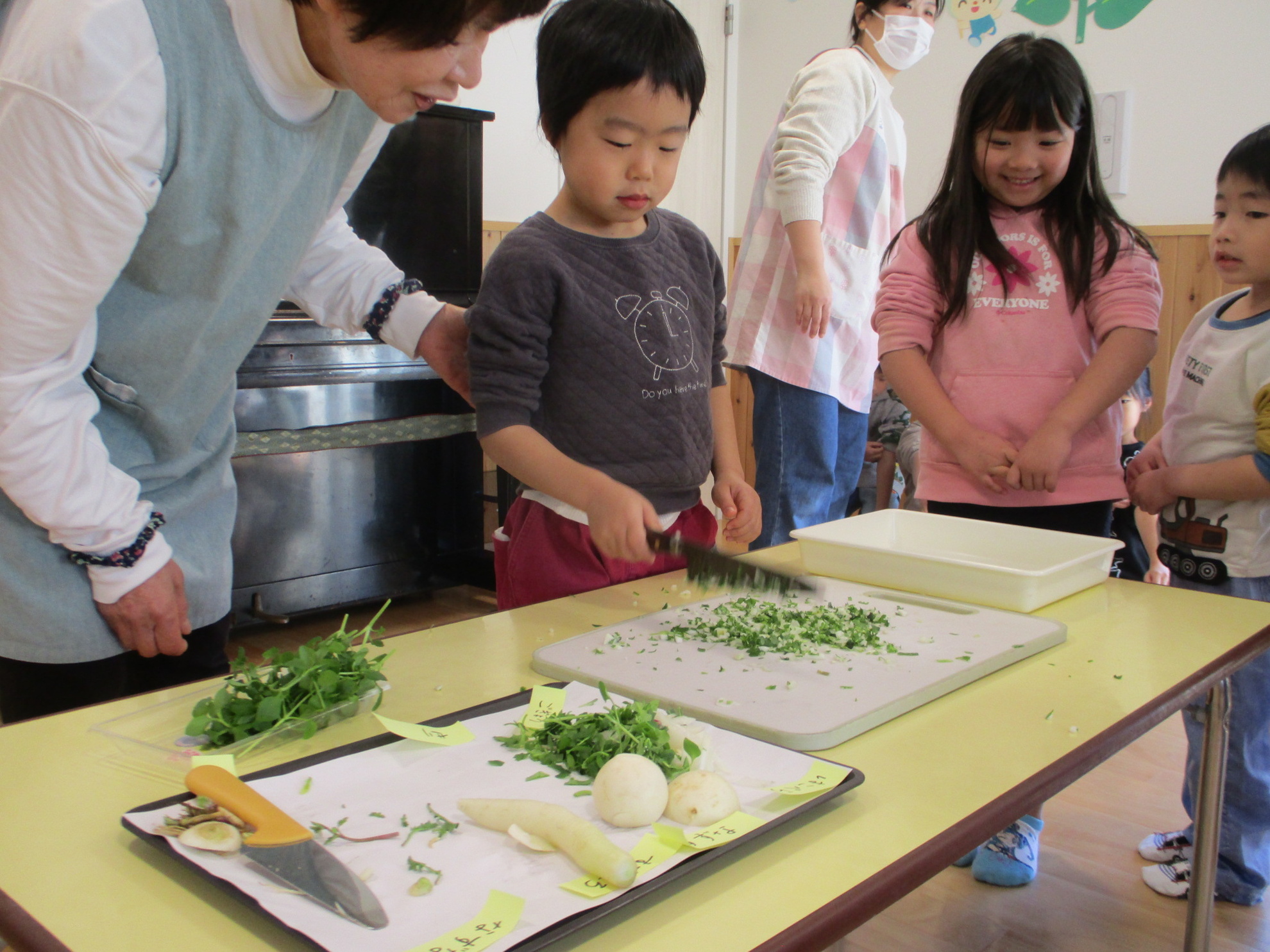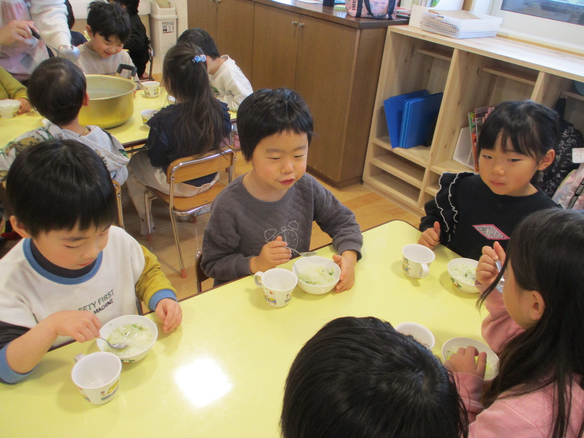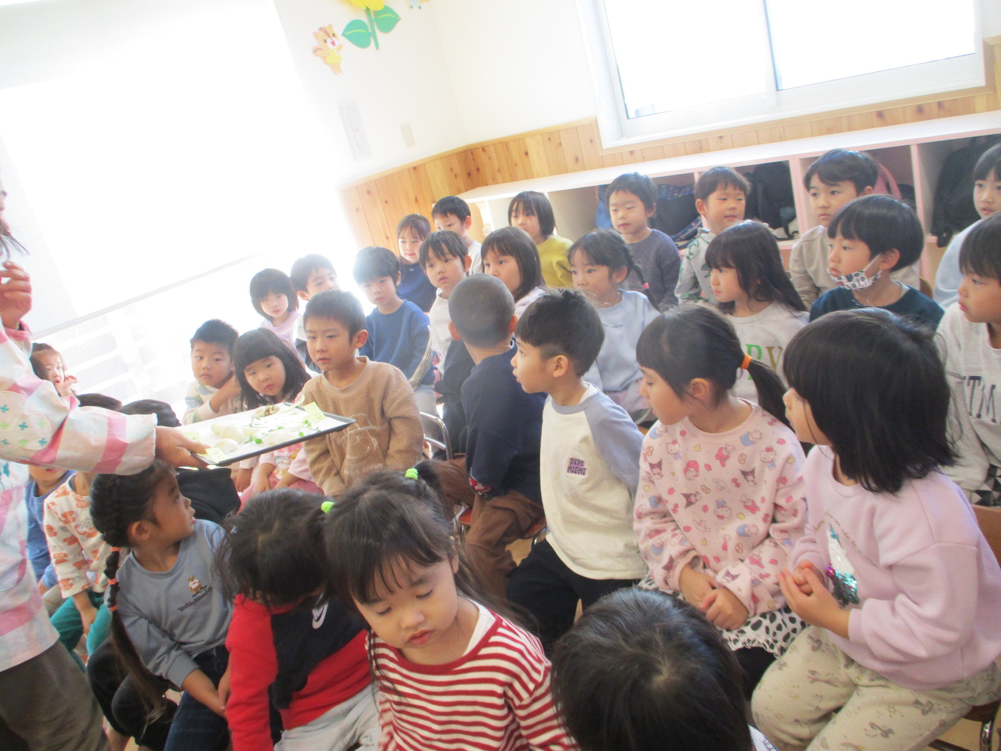 お正月にはどんな食べ物を食べたかな?という質問に、一番に答えがでたのが『黒豆』でした。次に『数の子』『かまぼこ』などの答えが・・・。沢山のご馳走を食べたので、疲れた胃腸を休めるために食べます。七草を皆で実物を見ながら言ってみました。 せり、なずな、ごぎょう、はこべら、ほとけのざ、すずな、すずしろ、これぞ七草です。おやつにいただきました。