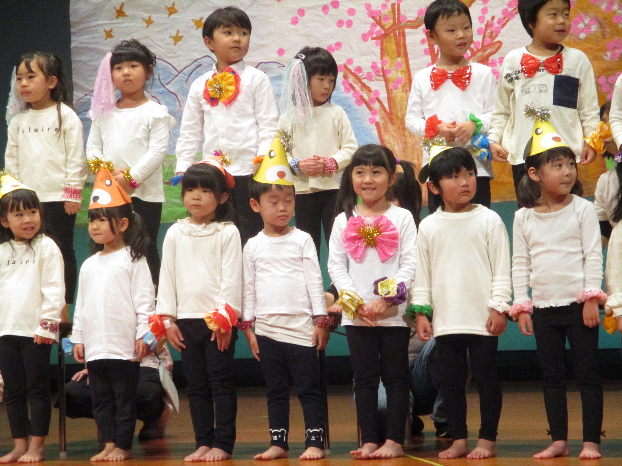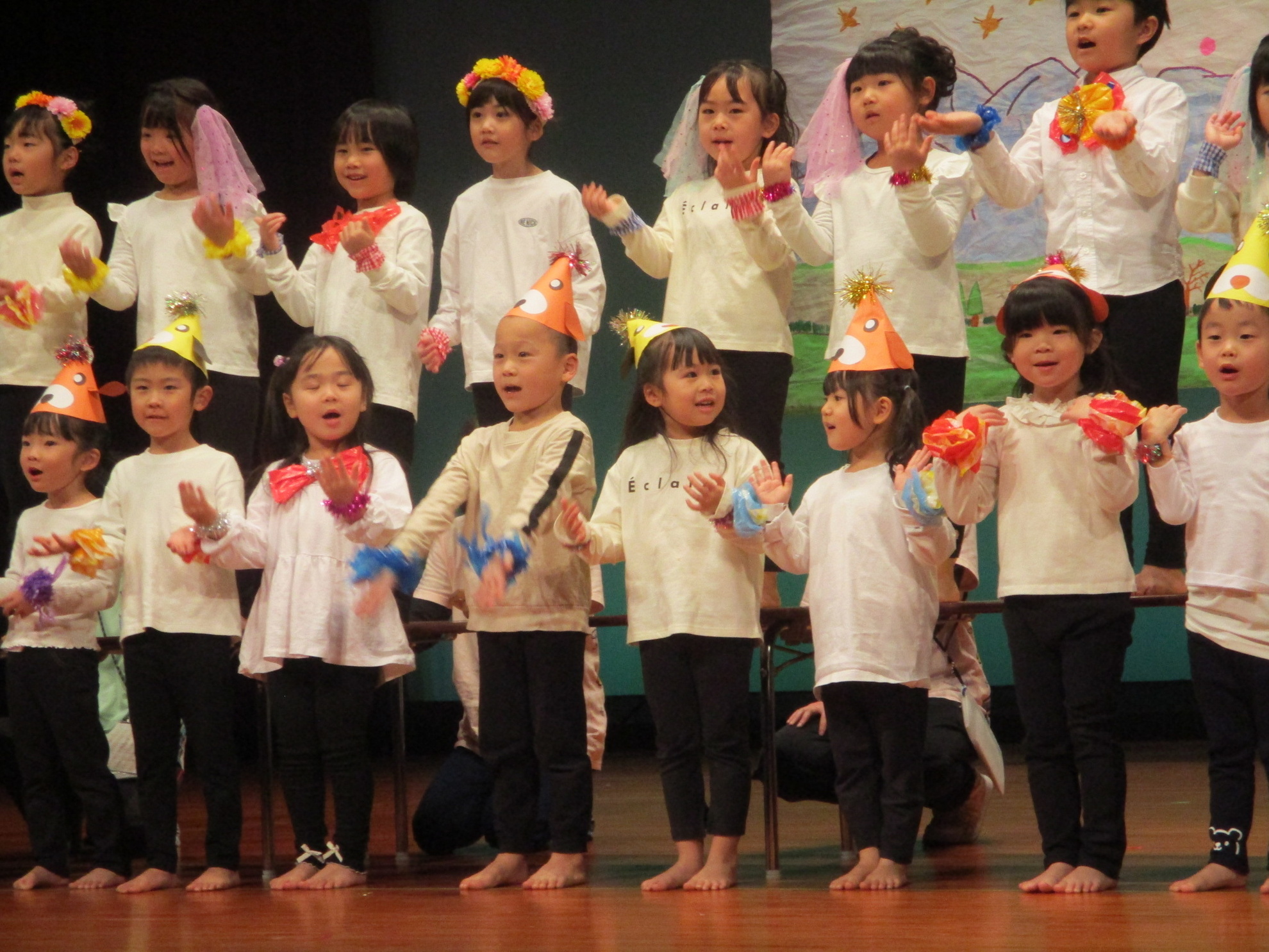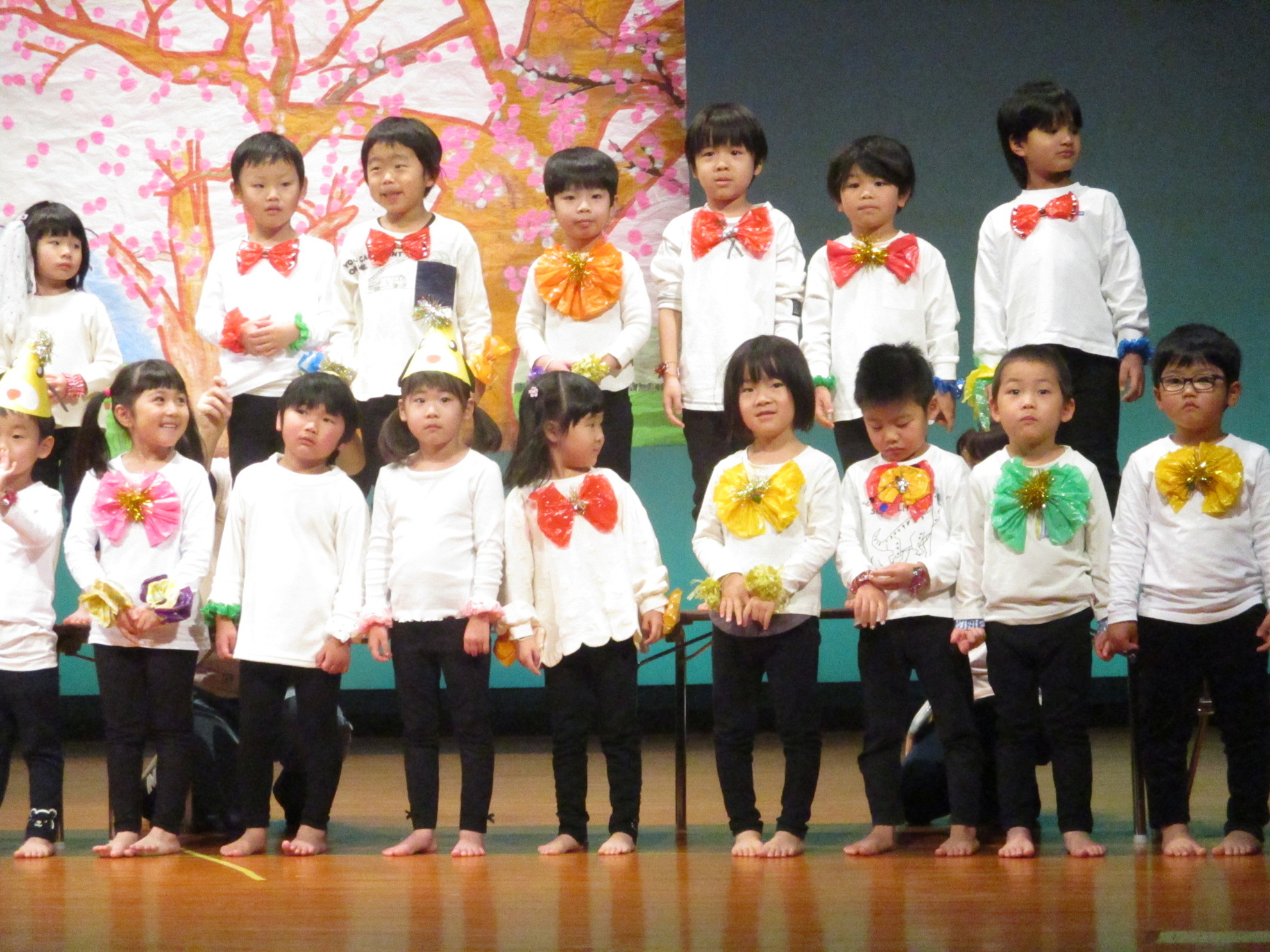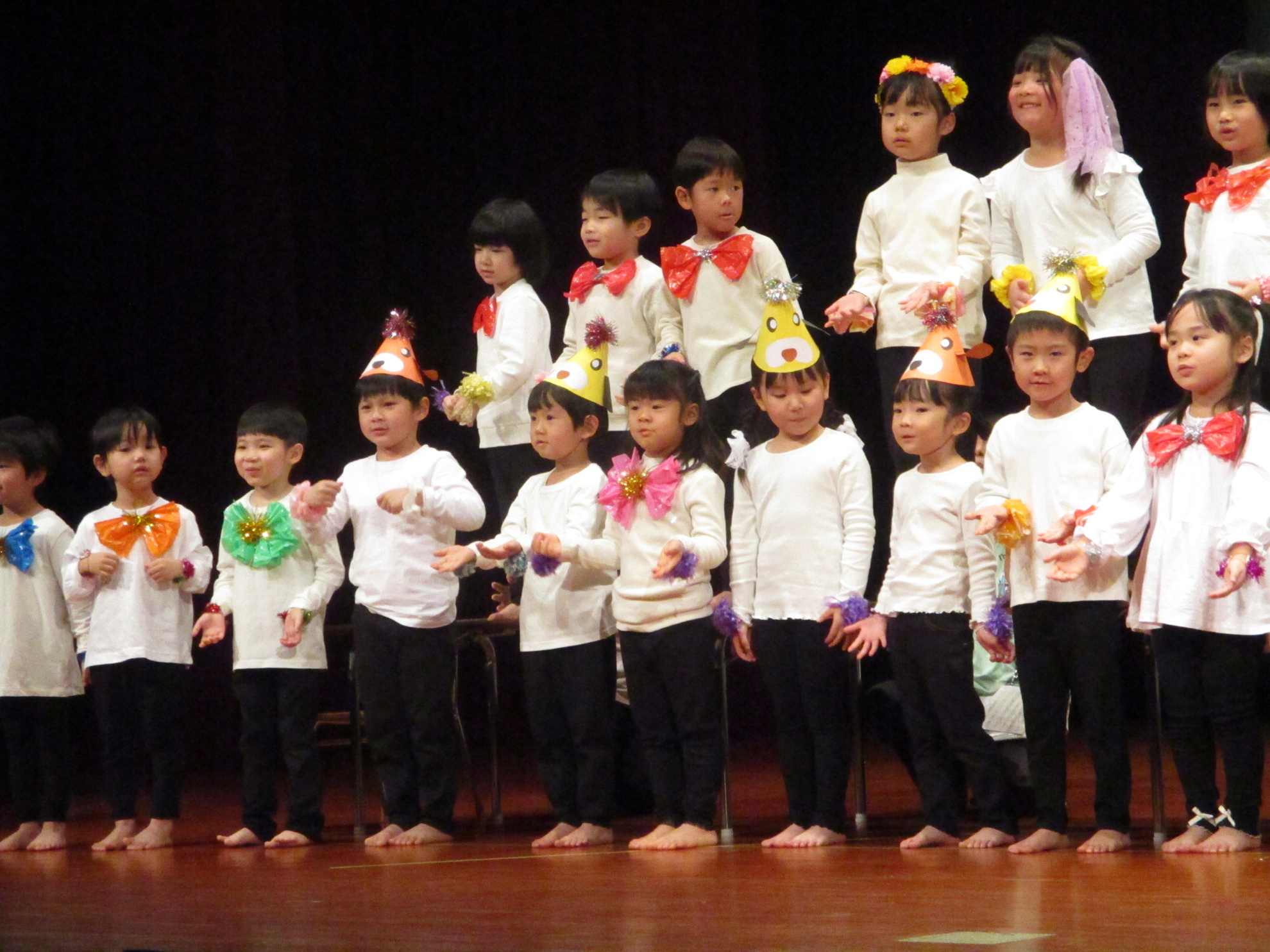 生活発表会がありました。 生活発表会には、沢山の応援や声援をありがとうございました。年齢に応じた発表で、子どもたちがそれぞれ頑張っていましたね。 今から生活発表会を始めます。 男子の着物姿もいいでしょ! しなやかな、足と手さばきが素敵です。 一番小さいクラスのお友だちも、舞台で頑張りました。可愛かったですね。 リトミックの先生とがんばりました。 十二支のお話は、どの子も素敵でしたね。 さくら、ふじぐみの合唱と合奏が最高に素敵で、キラキラ輝いていましたね。 瀬克発表会に沢山の応援や声援で子どもたちは無事に終える終えることができました。ありがとうございました。 カテゴリー: 投稿日:2026年01月13日 次へ