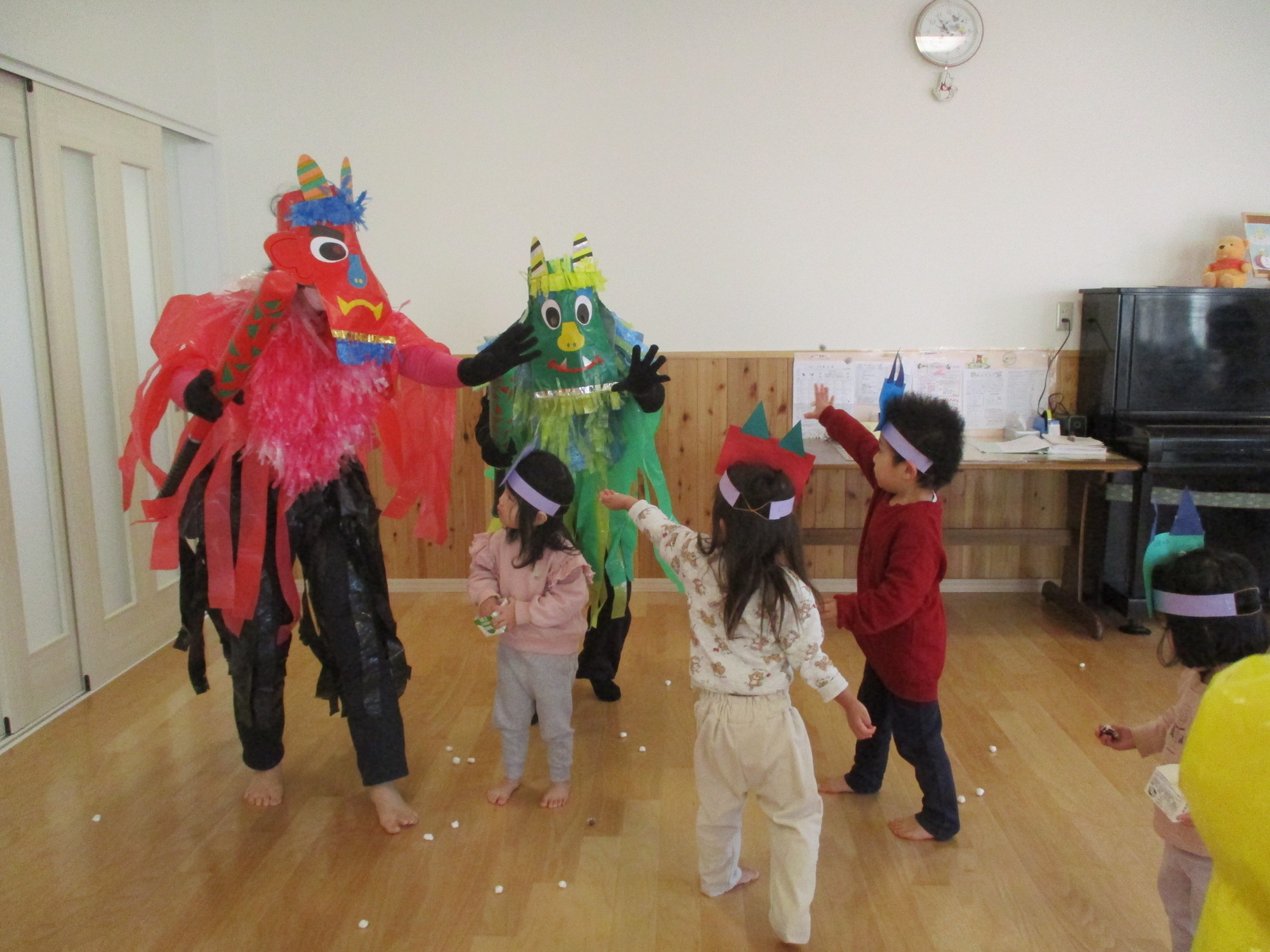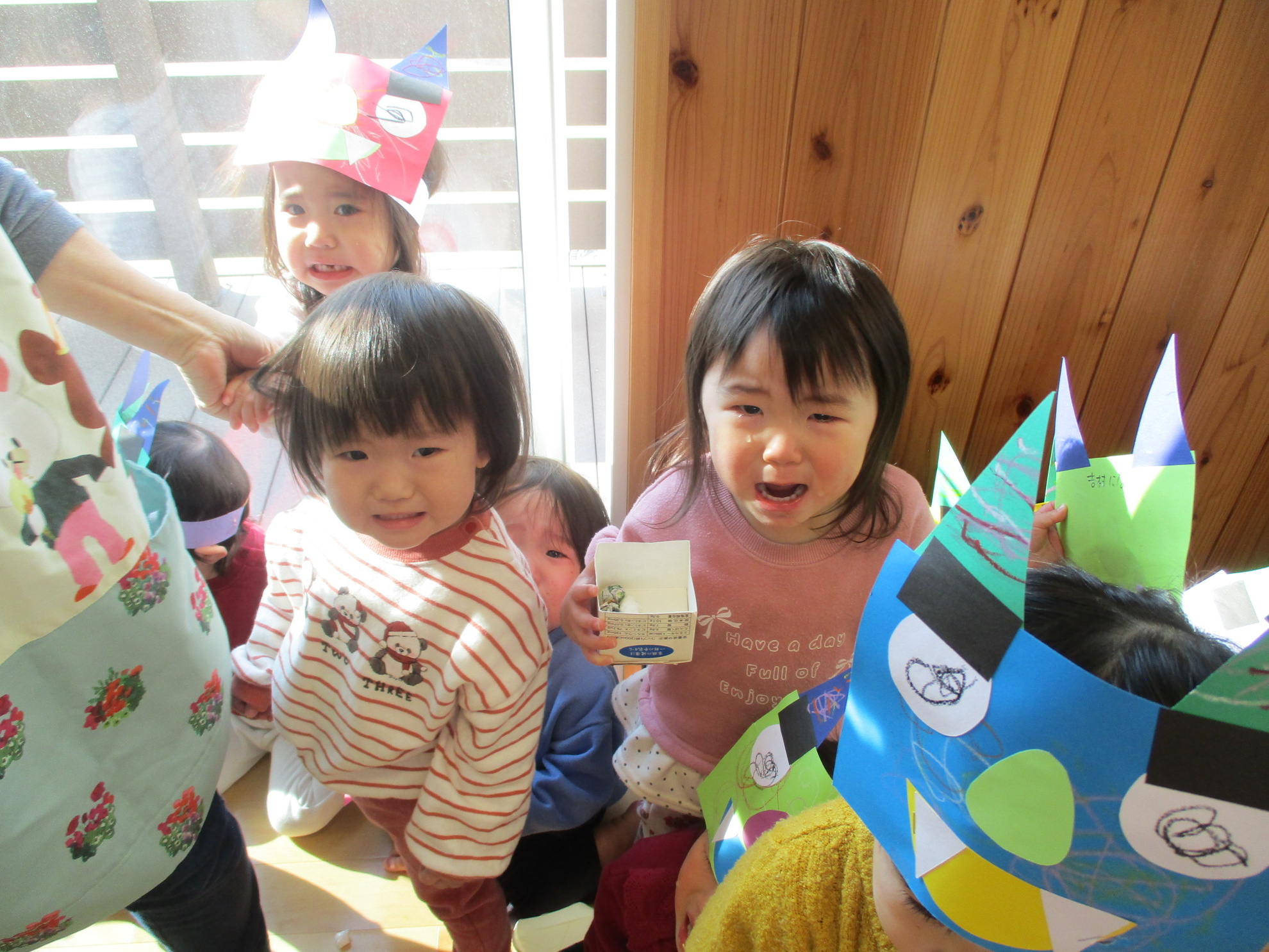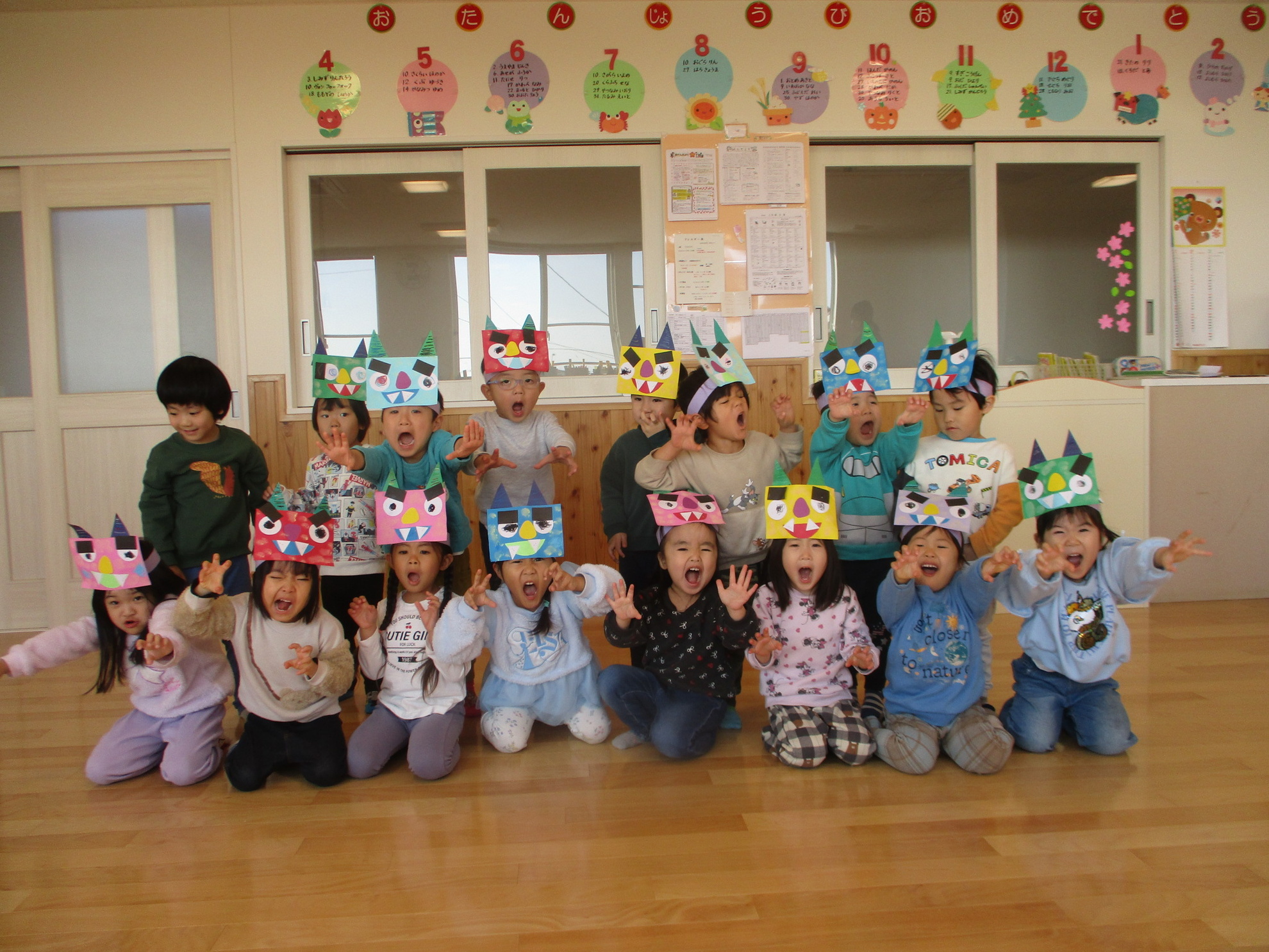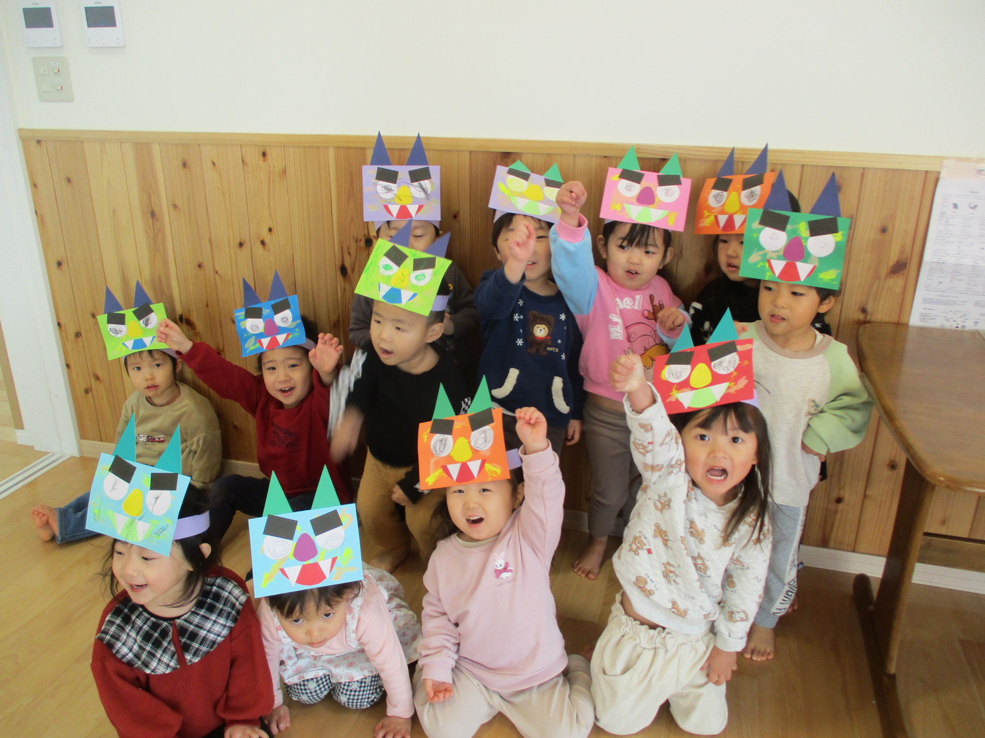 豆まきをしました 手作りの鬼のお面をつけて 豆まき頑張るぞ~! みんなかっこいいお面を作りましたね♪ 鬼がきた!! 怖がりながらも、頑張って豆を投げます… 最後は、鬼をやっつけました! みんな、よく頑張りましたね。 カテゴリー: 投稿日:2026年02月03日 次へ