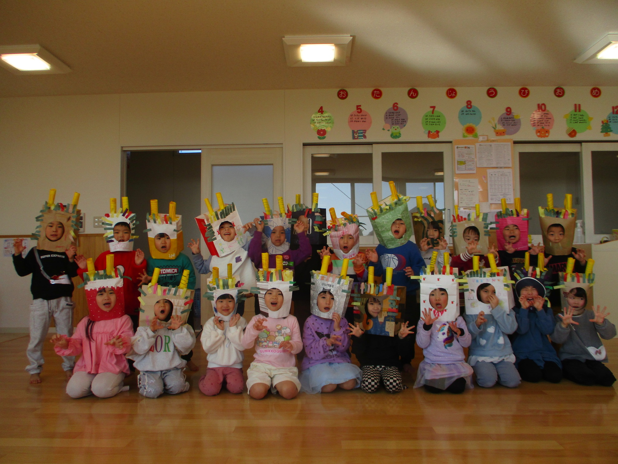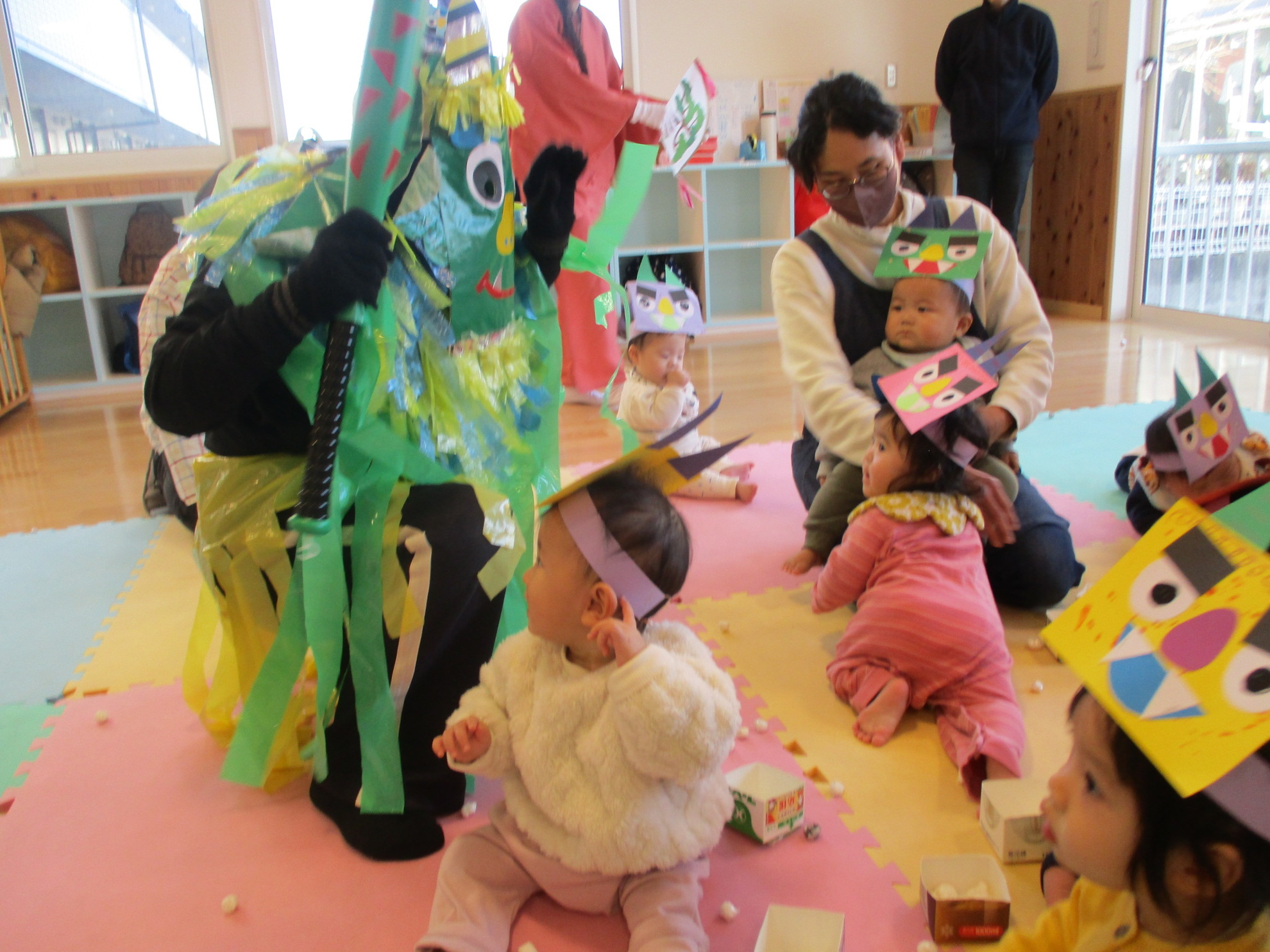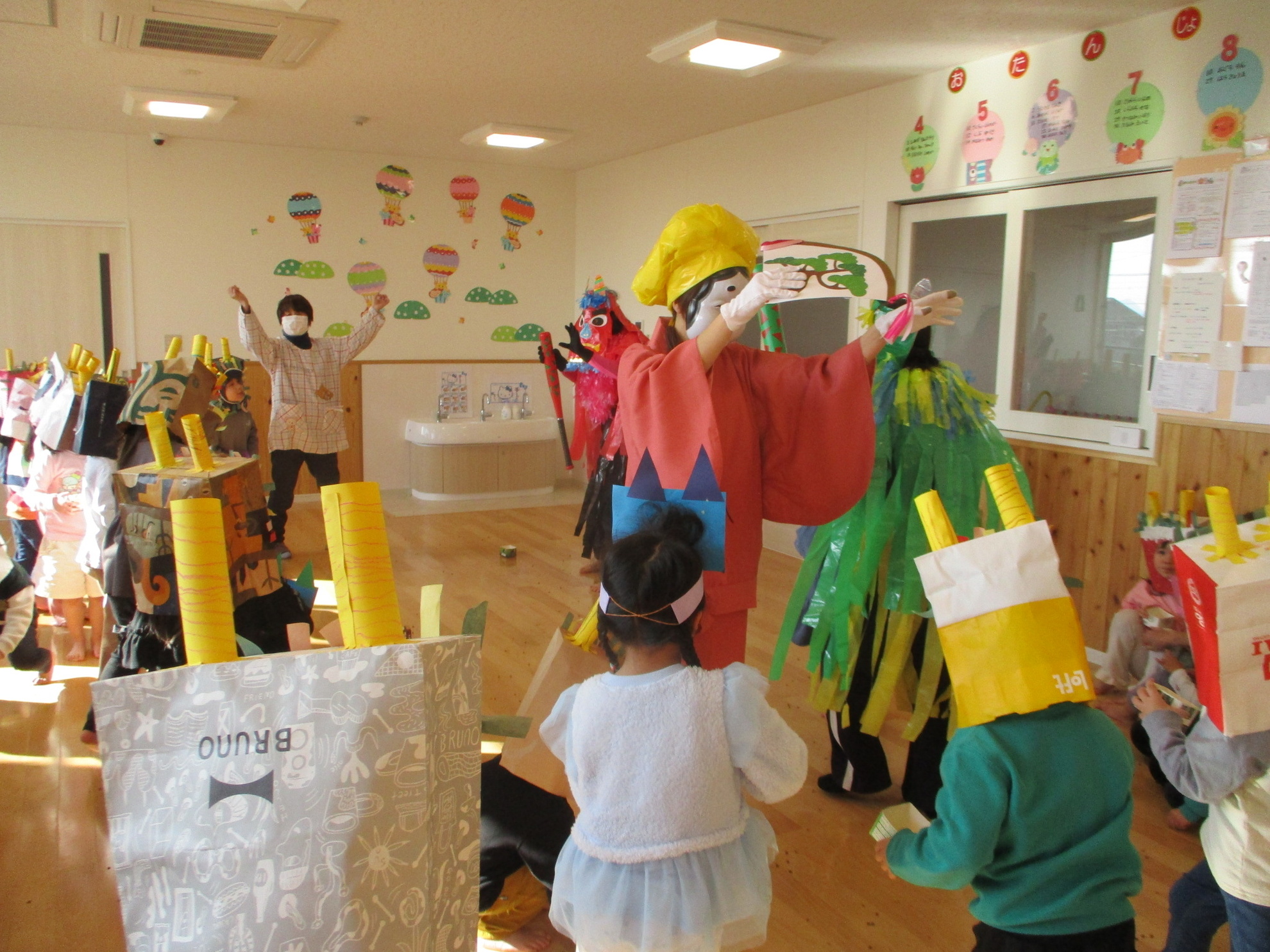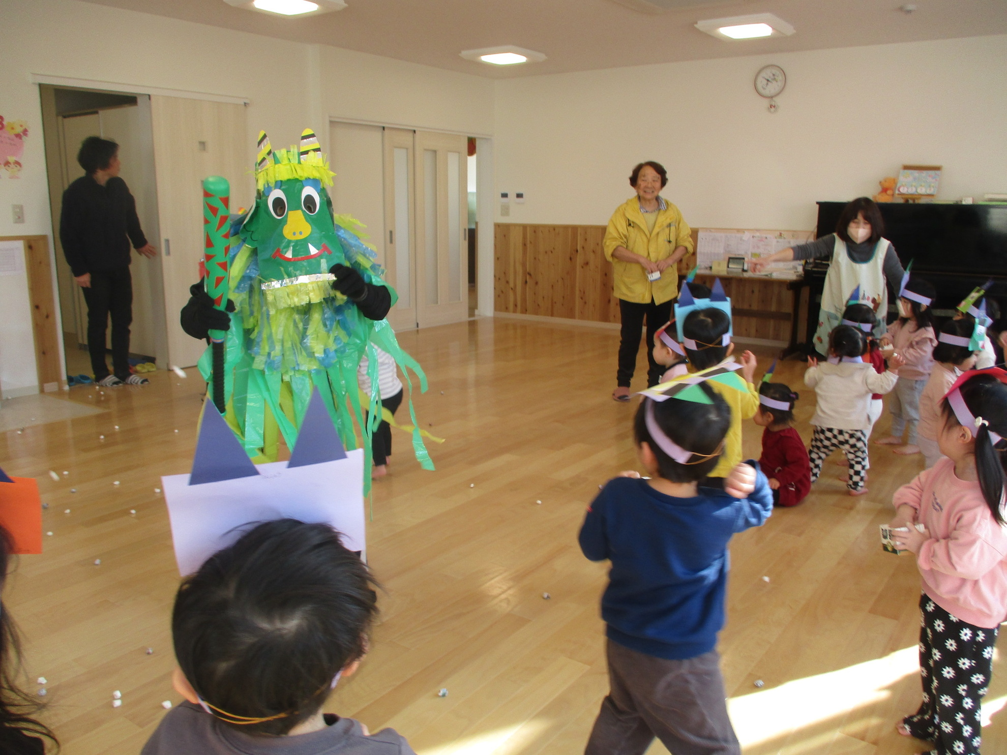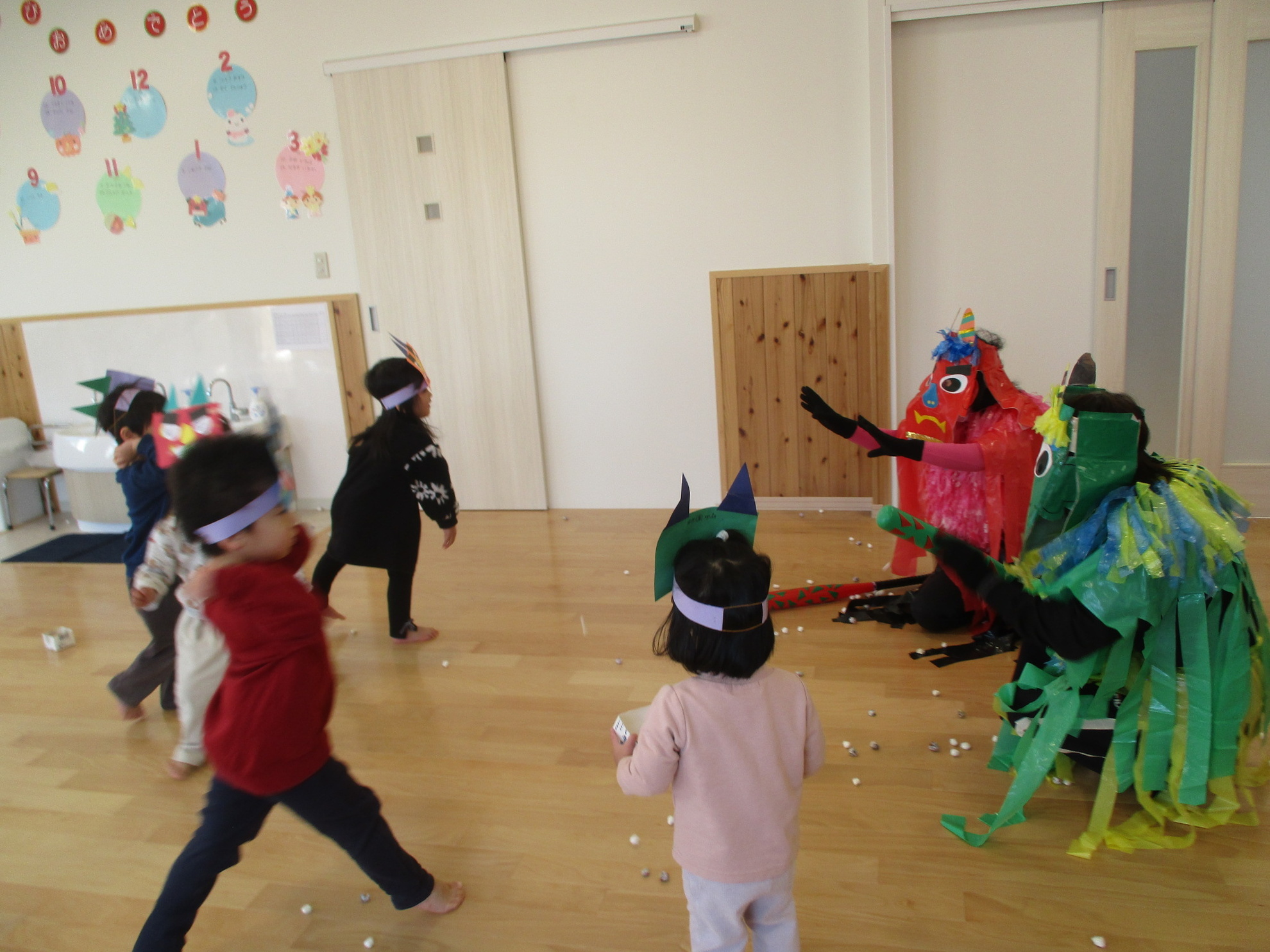 豆まきをしました 手作りの鬼のお面をつけて 豆まき頑張るぞ~! みんなかっこいいお面を作りましたね♪ 鬼がきた!! 怖がりながらも、頑張って豆を投げます… 最後は、鬼をやっつけました! みんな、よく頑張りましたね。 カテゴリー: 投稿日:2026年02月03日 次へ