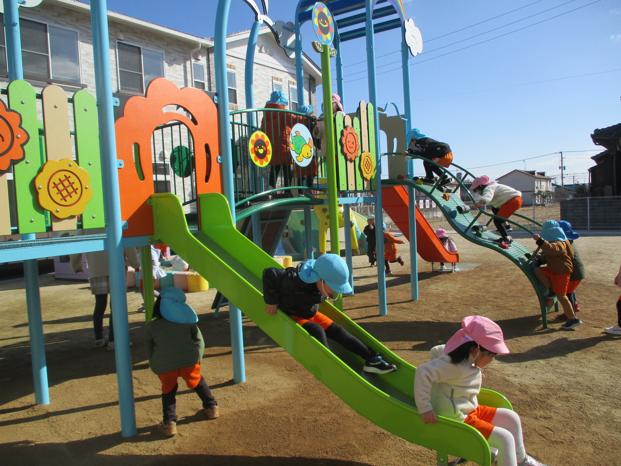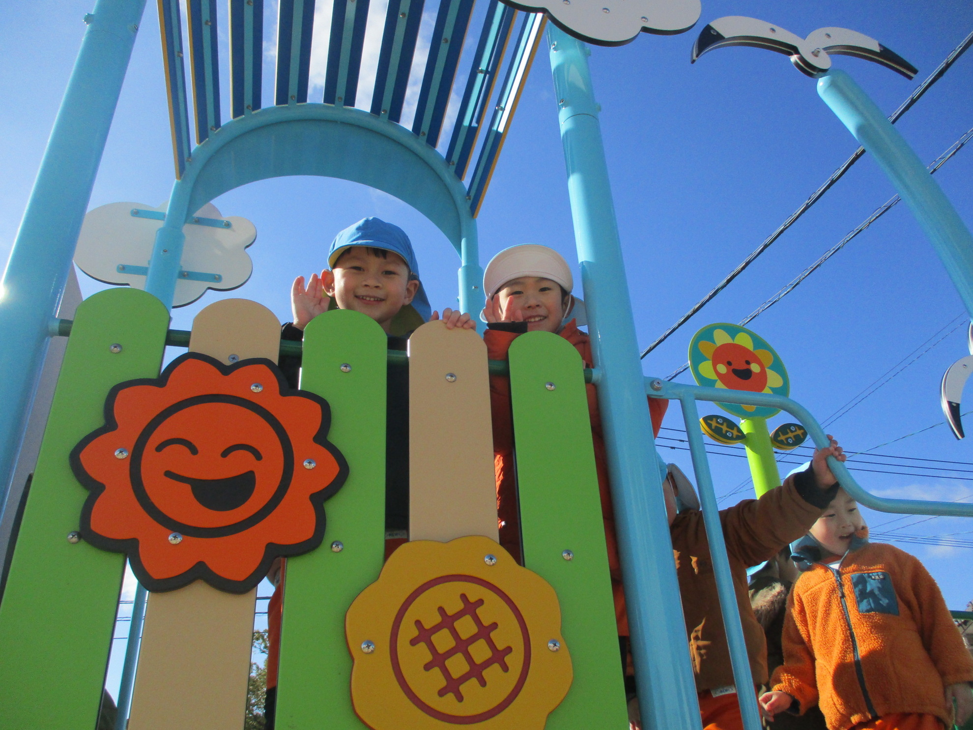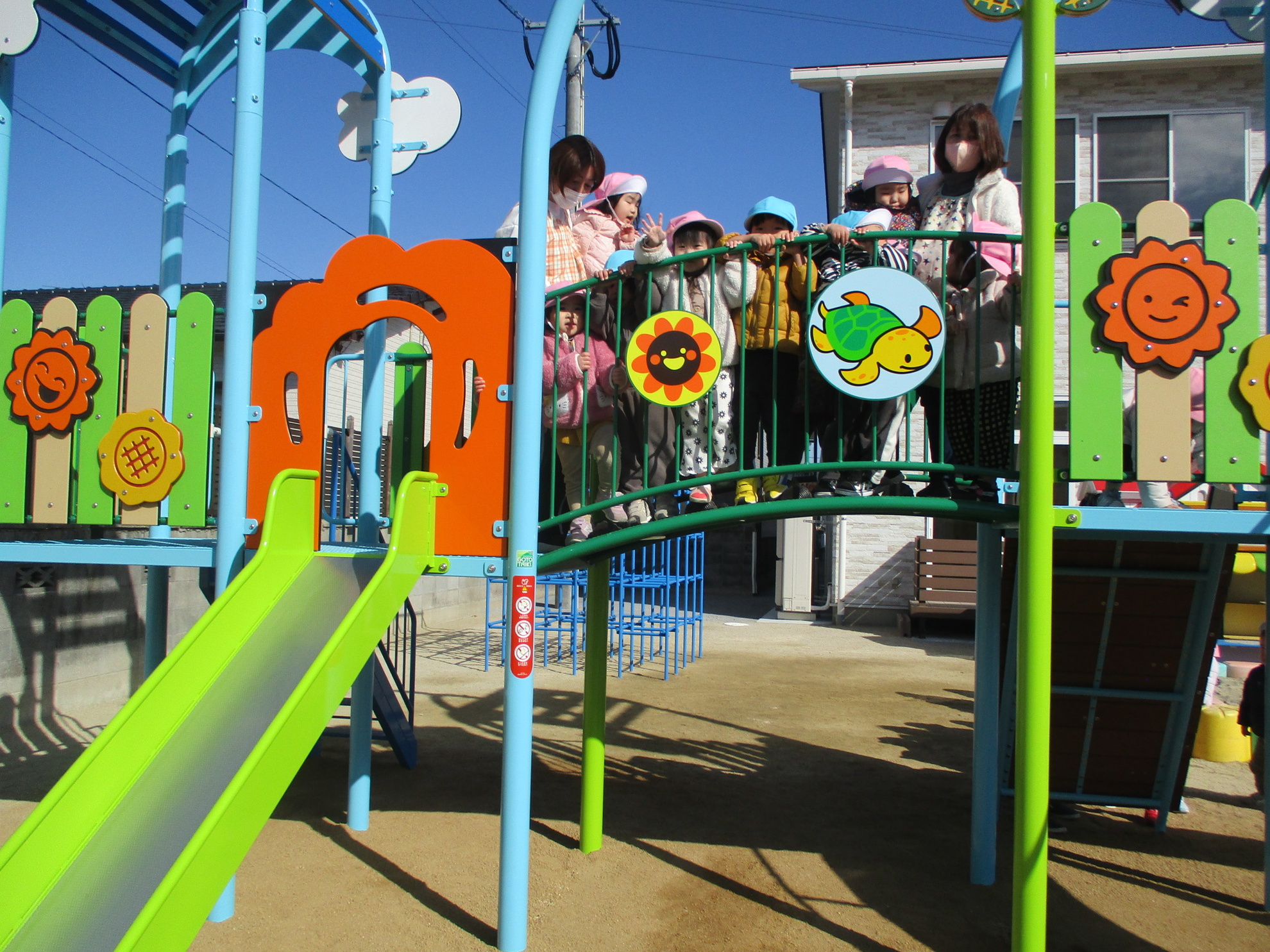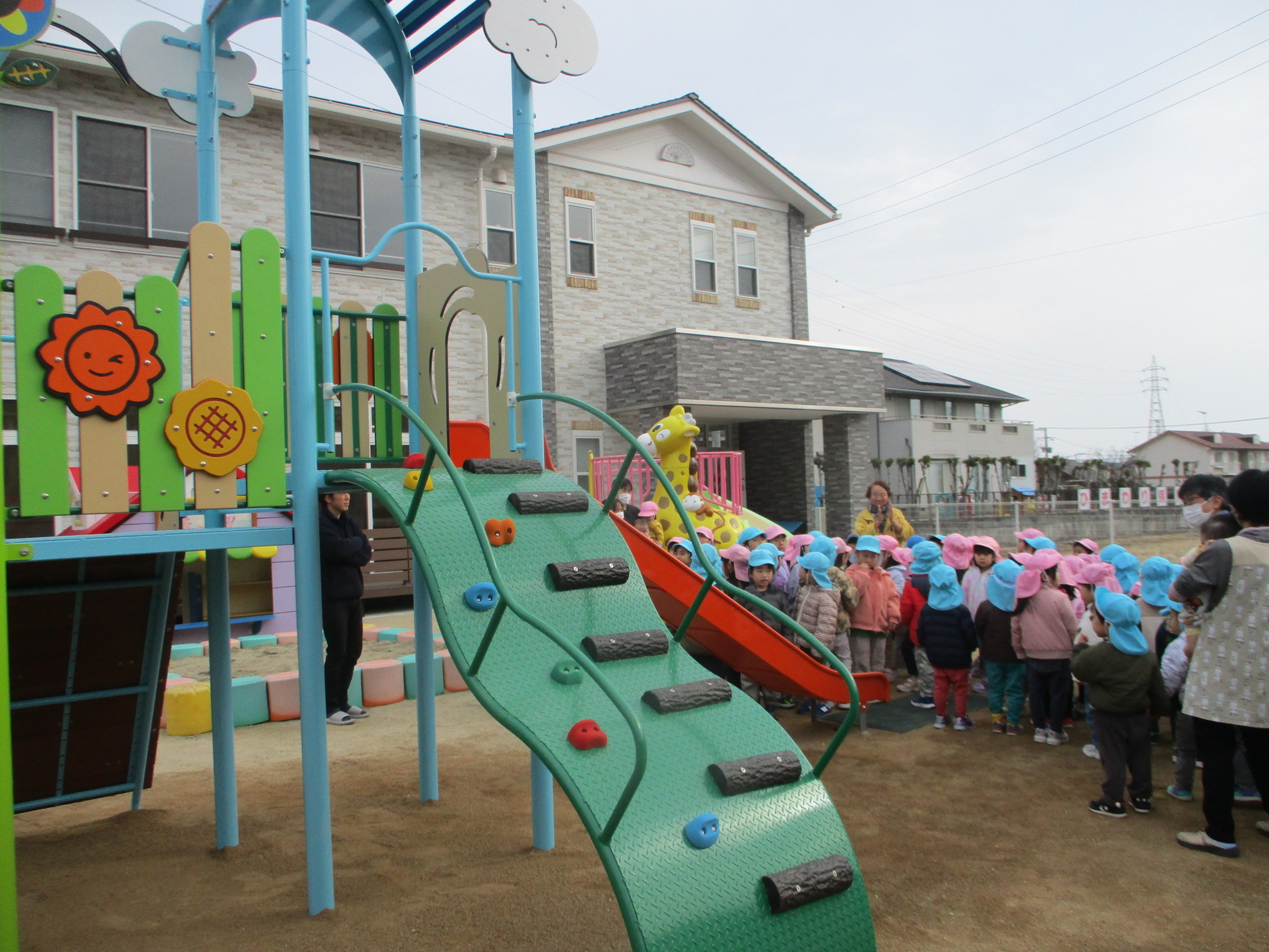 新しい遊具が完成しました 楽しみにしていた大きな遊具が完成して 遊べるようになりました! やった~!ばんざい! 園長先生と遊具で遊ぶときのお約束をして 早速遊びましょう♪ 大きな滑り台…ドキドキ… 順番に登ろうね。 やっほ~~! 上るのも滑るのも上手☆ 新しい遊具楽しいね! これからたくさん遊ぼうね(^^)☆ カテゴリー: 投稿日:2026年02月06日 次へ