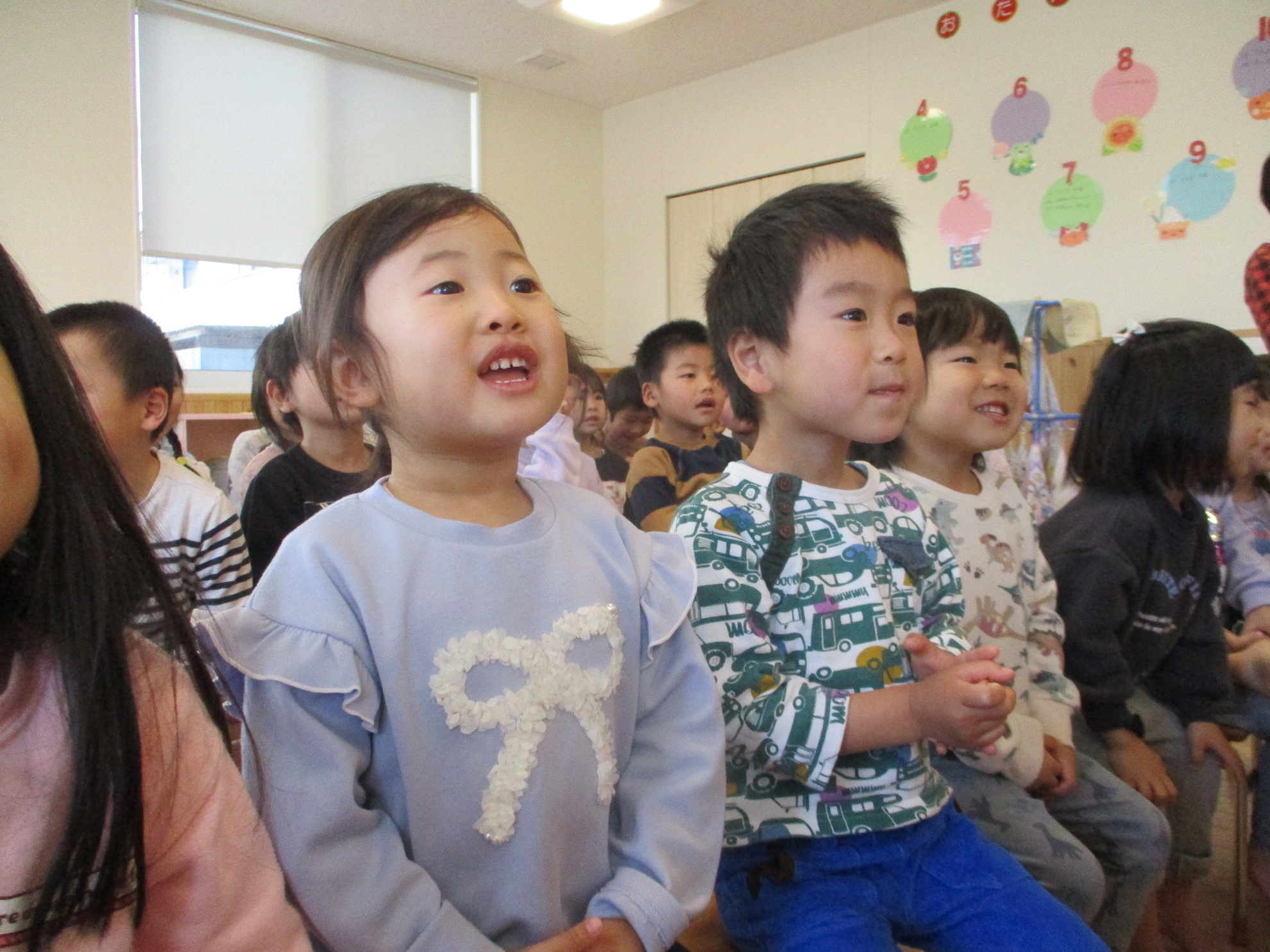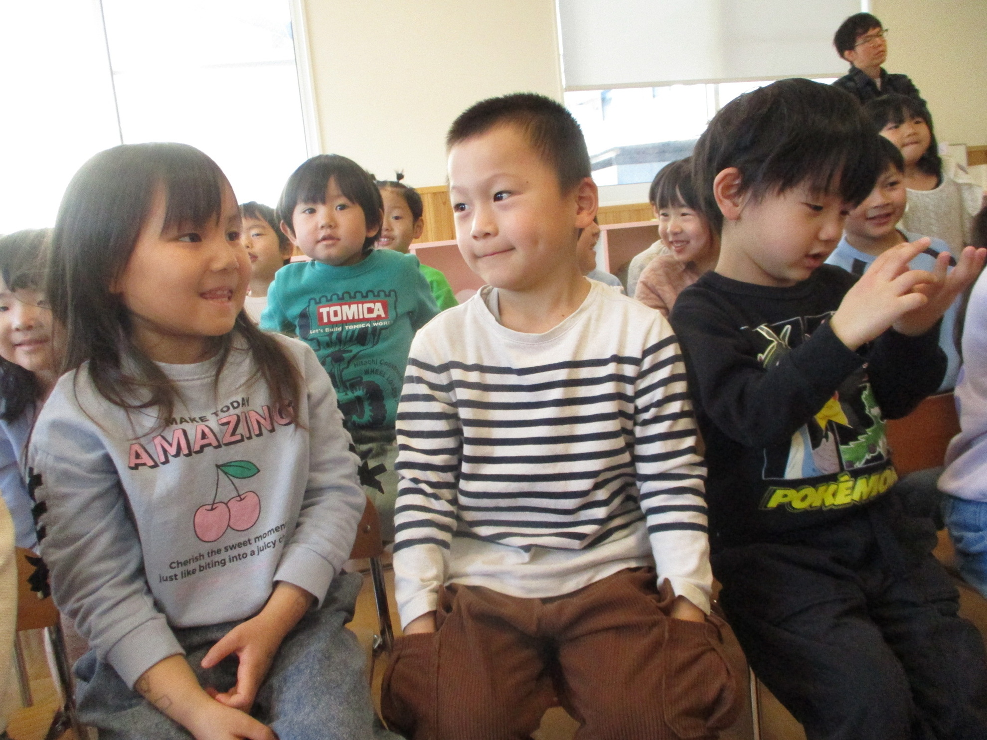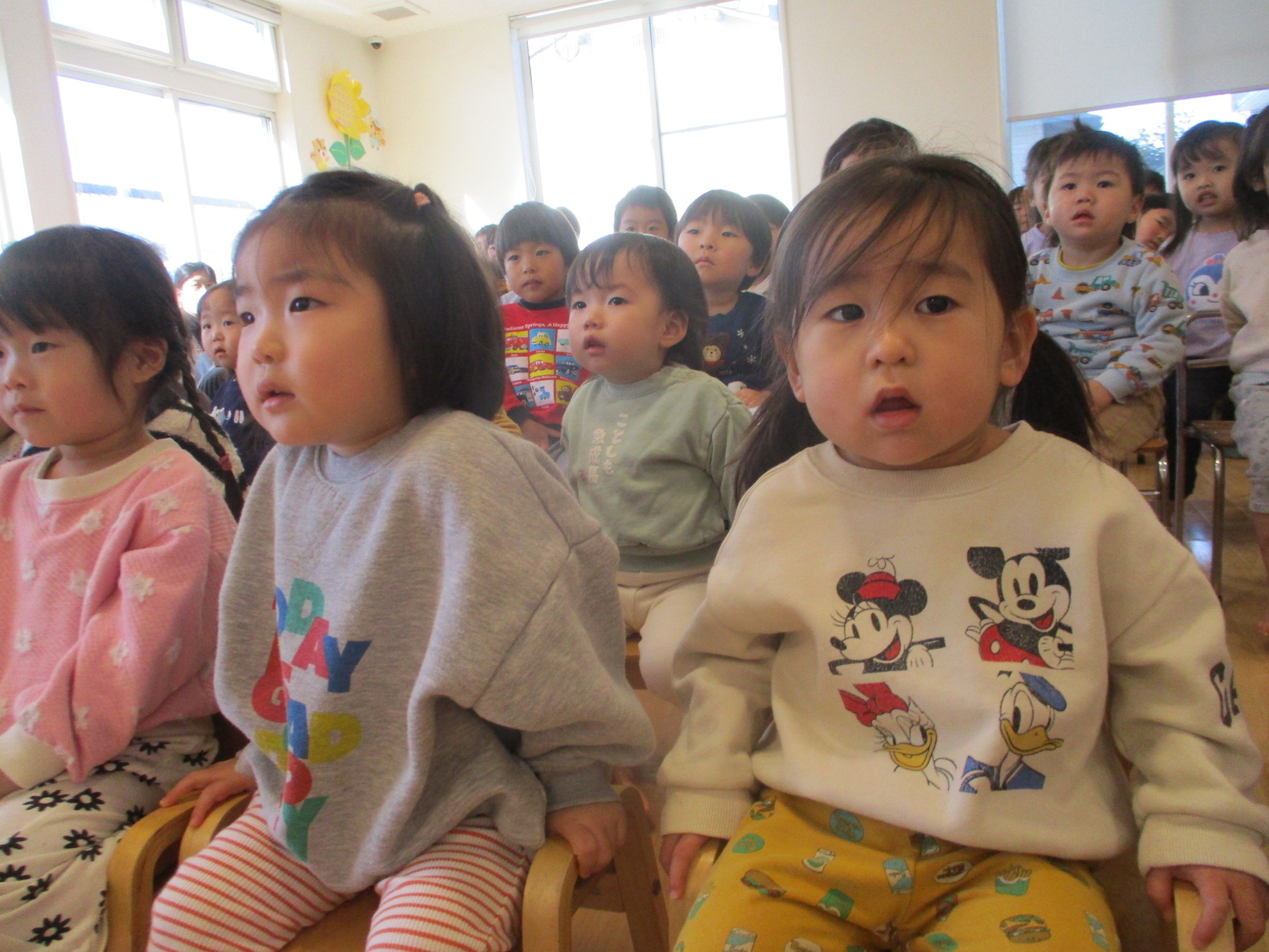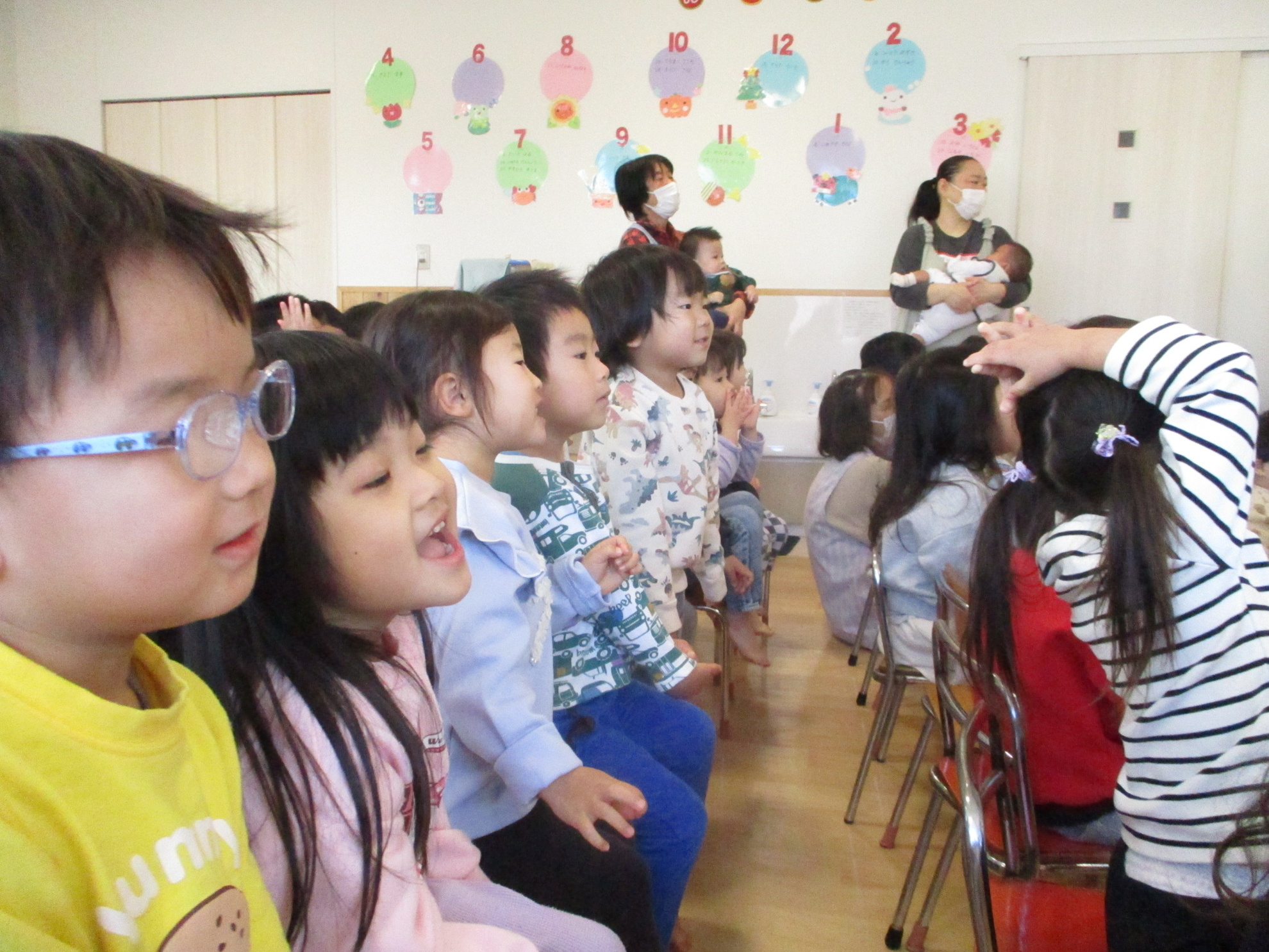 2月生まれの誕生日会を行いました。 2月生まれのお友だちです! お誕生日おめでとう! みんなで誕生日の歌を歌って お祝いをしました。 そのあとは、手品を見てびっくり!! 興味津々で見ています みんなで魔法をかけたら、 お誕生日ケーキがでてきたよ! おやつにケーキを食べようね(*^^*) カテゴリー: 投稿日:2026年02月18日 次へ